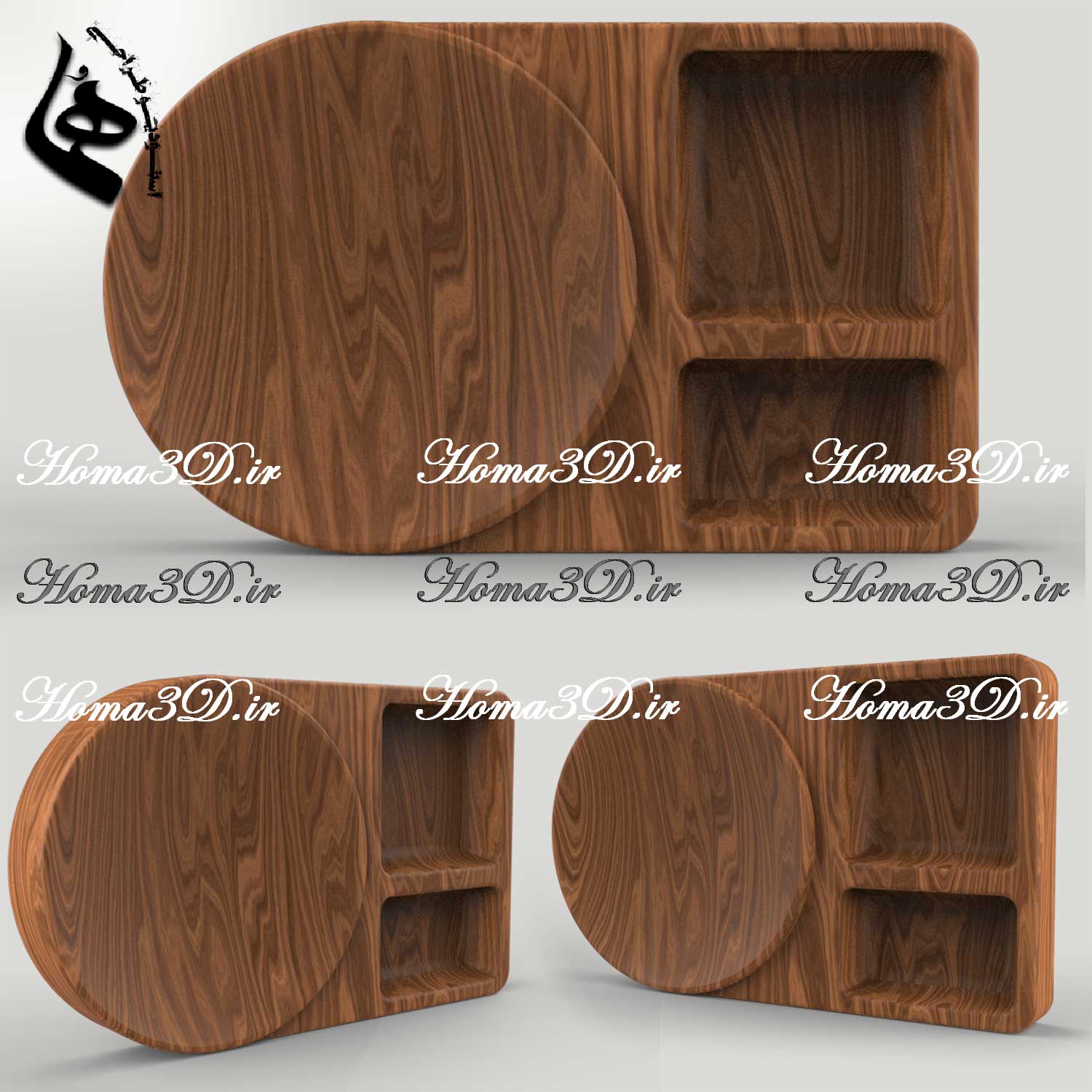 تمام مدلها و فایلهای سهبعدی ظروف چوبی از جمله این پلوخوری، توسط متخصصین استودیو طراحی هما با بیش از ۱۵ سال تجربه در طراحی سهبعدی مبلمان، منبت، قالبسازی و دکوراسیون داخلی طراحی و تولید شدهاند.
